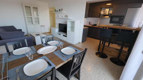 Logement familial, spacieux et ensoleillé, situé en dernier étage d'une résidence avec piscine, proche des commodités.Il est composé de 2 chambres avec chacune, 2 lits simples, une très grande cuisine toute équipée, un salon avec un canapé convertible, une salle à manger donnant sur la terrasse. Un garage en sous-sol sécurisé vous permet de stationner votre véhicule facilement.A 3 minutes en voiture des plages de Golfe Juan et idéalement situé pour visiter les villes alentours. En supplément de la location : - taxe de séjour de 3 % du prix de la nuitée X jrs X pers. Versement de 25 % à la réservation. Le solde, incluant la taxe de séjour, sera payable 15 jours avant votre arrivée par virement bancaire. Le jour de votre arrivée, merci de vous présenter à l’agence afin de régler la caution non encaissée. Juillet et Août, 1050 € la semaine. Disponibilité, devis étudié et renseignements complémentaires sur demande.